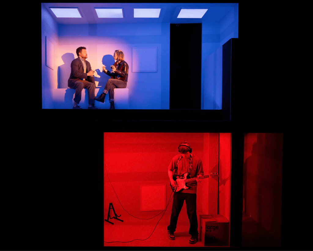 Although the play centres around self-harm, it never becomes relentlessly heavy. Stylised interludes, supported by visual and sound cues give us room to breathe and digest the previous moments (also shout out to Zoë Hurwitz’s incredible set design). If anything, I found myself wanting more insight into Niall’s past and what led him to this point – aspects the play never quite reveals. Brigid eventually introduces her boyfriend, Michael (Conor O’Donnell) to Niall, a man who begins as an awkward, patronising presence tiptoeing around the subject of self-harm, only to later reveal a darker side, manipulating Brigid’s relationship with Niall to serve his own agenda. His behaviour throws the strength of the siblings’ bond into sharp focus and we see how deeply they care for each other and how much Brigid needs Niall just as much as he needs her. McAlinden as Niall gives a particularly memorable and moving performance, effectively demonstrating both the mental turmoil and drive for independence the character is battling with.